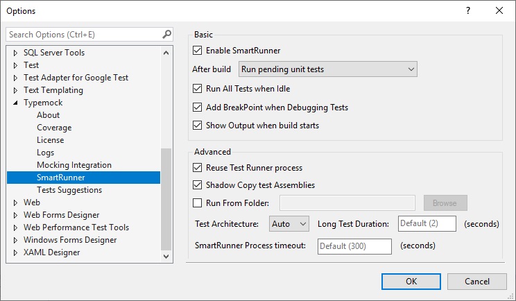 2. In the options list, select Typemock > SmartRunner.