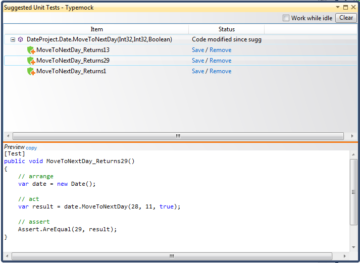 You can manually invoke automatic suggestion for any method. After tests are suggested, the Typemock Suggest window is displayed. Each test is accompanied with an icon that represents the status of the test: