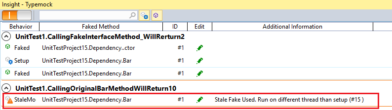 C# public class ClassUnderTest { public static Dependency fooField ; public static int Foo() { return fooField.Bar(); } } public class Dependency { private int bar = 10; public int Bar() { return bar; } } [TestClass, Isolated] public class UnitTest1 { [TestMethod] public void CallingFakeInterfaceMethod_WillRerturn2() { //Arrange //setting the static field "fooField" as a fake of Dependency class var fakeDependency = Isolate.Fake.Instance<Dependency>(); ClassUnderTest.fooField = fakeDependency; Isolate.WhenCalled(() => ClassUnderTest.fooField.Bar()).WillReturn(2); //Act var res = ClassUnderTest.Foo(); //Assert Assert.AreEqual(2, res); } [TestMethod] public void CallingOriginalBarMethodWillReturn10() { //Act //When this test will run after the previous one the "fooField" will still be faked (a Stale Mock) //ClassUnderTest.Foo will return 0 as the "bar" field of Dependency hasn't been set to 10 becuase it was faked var res = ClassUnderTest.Foo(); //Assert Assert.AreEqual(10,res); } }