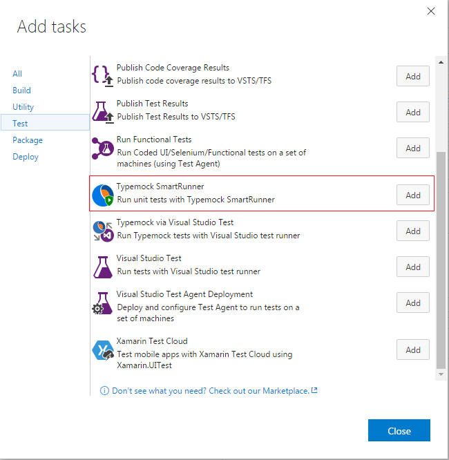 Once you installed you can add the Typemock SmartRunner Task to your build definition from the test section of the Add Step wizard