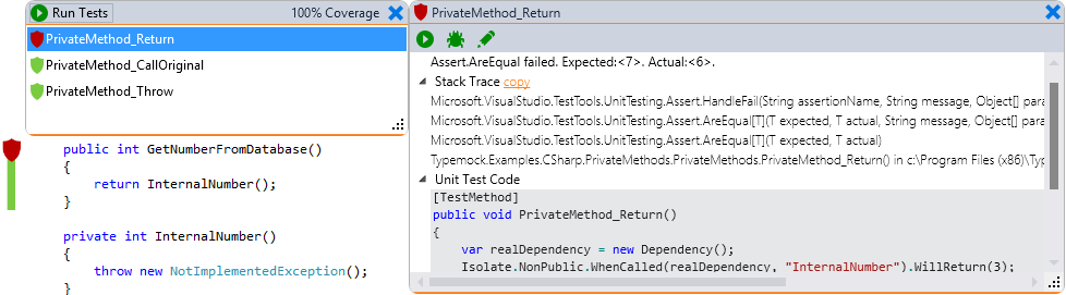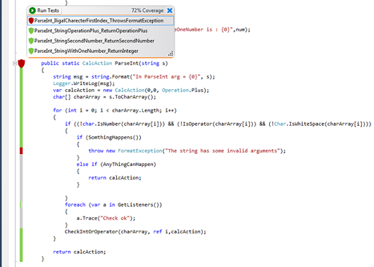 The Test Preview window is displayed. In this window, you can view the test code, console output, and stack trace. When the Method window opens, you can also see the combined coverage of all tests. This gives you a complete view of the problem. You can see the scenarios that behave incorrectly. In most cases, this is enough to resolve the problem without actual debugging.
