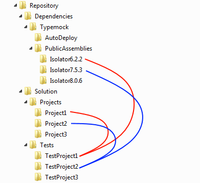 A repository might look like this when 3 projects use 3 versions of Typemock.