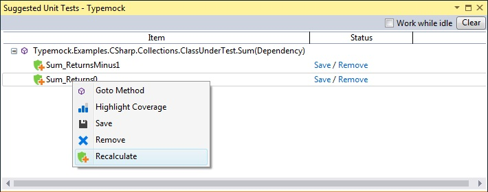 •When you want different automatically suggested test or your code has changed, right-click on the test name, and in the context menu click Recalculate to change the test.