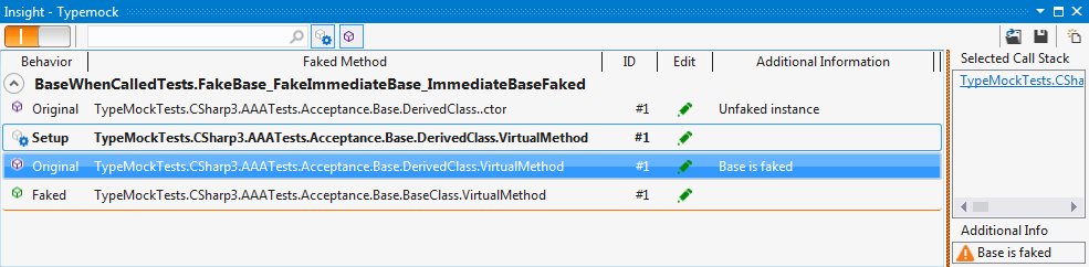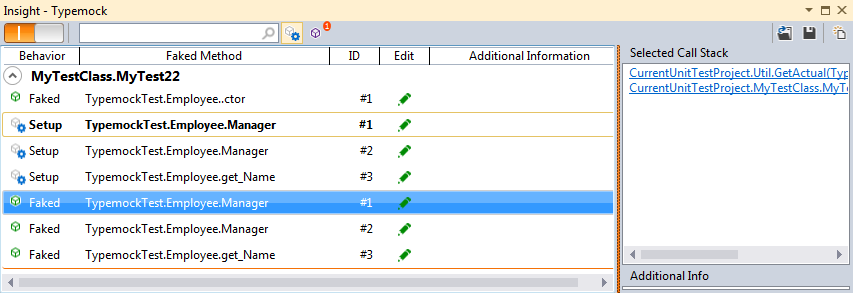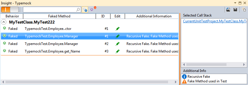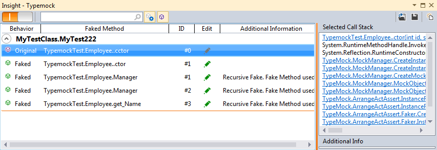 Clicking on a line will show you the call stack of the faked method (where it was called in the test – on the right).