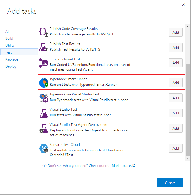 Once you installed you can add the Typemock SmartRunner Task or the Typemock via Visual Studio Test Task to your build definition from the test section of the Add Step wizard